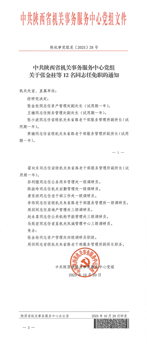 中共陕西省机关事务服务中心党组关于张金柱等12名同志任免职的通知