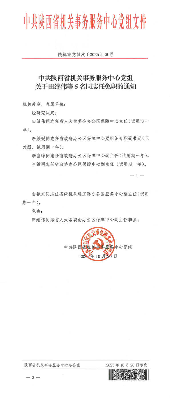 中共陕西省机关事务服务中心党组关于田继伟等5名同志任免职的通知