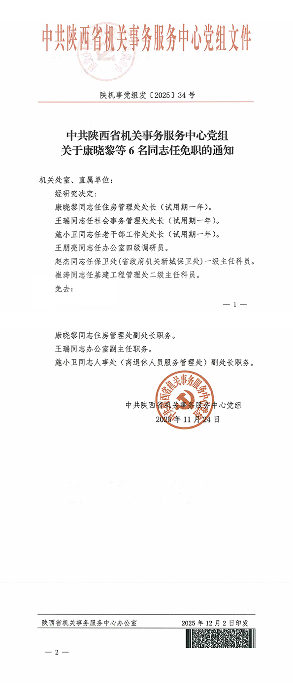 中共陕西省机关事务服务中心党组关于康晓黎等6名同志任免职的通知