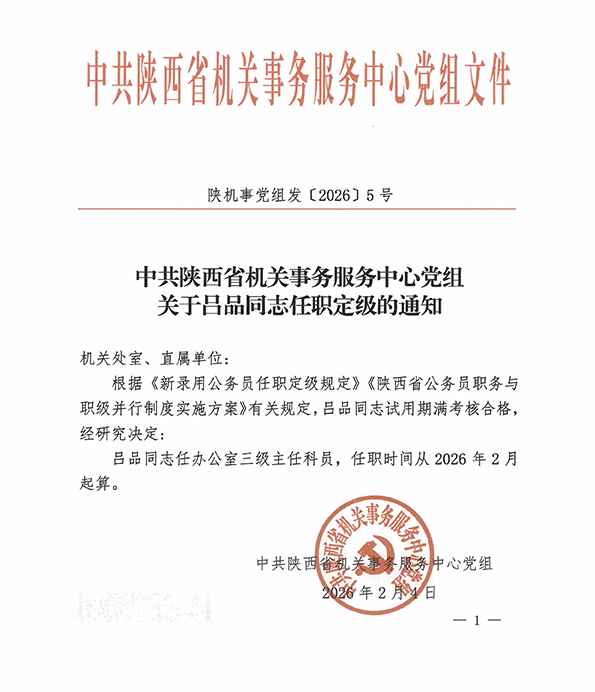 中共陕西省机关事务服务中心党组关于吕品同志任职定级的通知